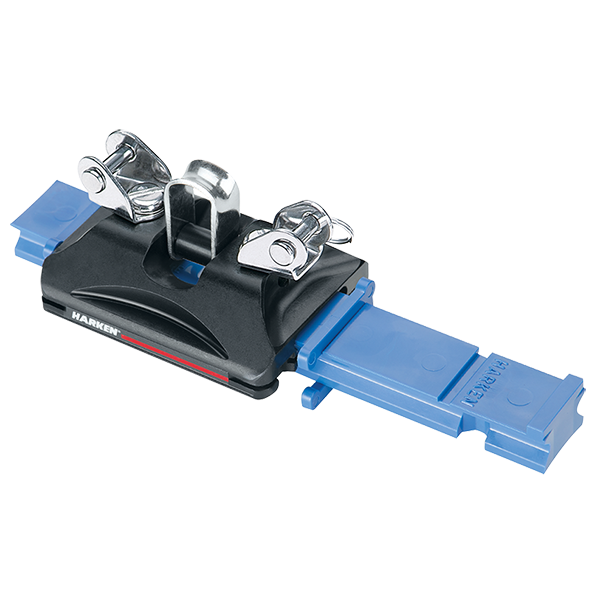 Harken ball bearing traveler cars with multipart purchases allow easy adjustment of loaded sails from the cockpit.