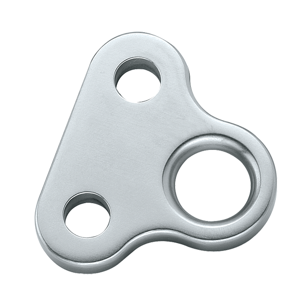 Stainless steel tack adapter tangs are used to adapt pin diameters on headstays to the standard clevis pin size that comes on the Harken Small Boat underdeck furling unit. A third hole accepts lashing to adjust jib luff tension.