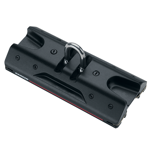 Harken ball bearing traveler cars with multipart purchases allow easy adjustment of loaded sails from the cockpit.