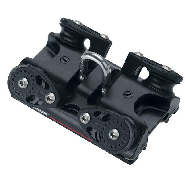 Harken ball bearing traveler cars with multipart purchases allow easy adjustment of loaded sails from the cockpit.